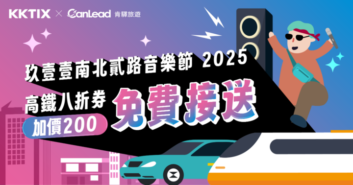 |購票資格| 在指定期間購買玖壹壹南北貳路音樂節 2025 門票且無退票者,憑【訂單編號後 5 碼 + 票號全碼】於指定時間 購買八折高鐵票 即可獲得 加購 200 享免費接送 之優惠 購票期間 加價購優惠期間 即日起~10/23 23:59 10/28 12:00 起 10/